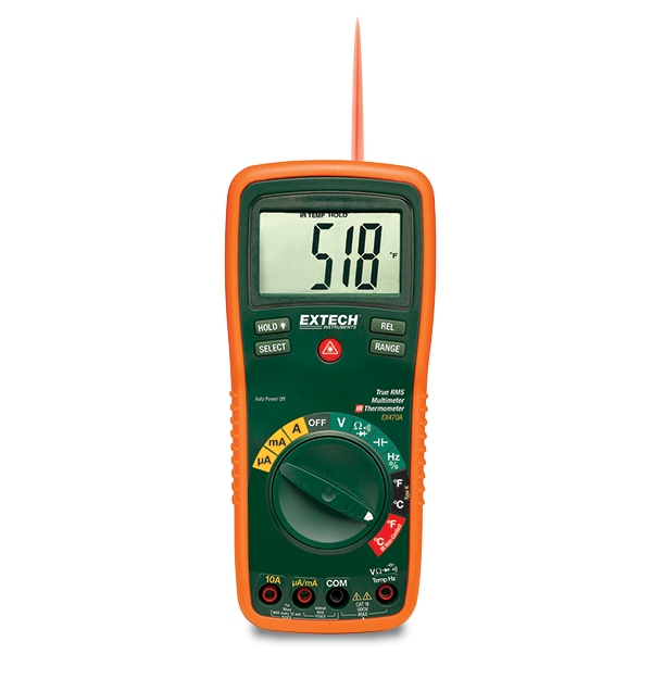 The Extech EX470A True RMS Multimeter and Infrared Thermometer with capacitance, frequency, and duty cycle measurements and 2 Type K remote probes is the perfect meter for HVAC or plant maintenance. The IR thermometer measures surface temperature from -20°C to 270°C (-4°F to 518°F) without contact. The built-in laser pointer centers the measuring area. Its functions include AC and DC Voltage to 600 V, AC and DC current to 10 A, resistance to 40 MOhm, continuity, and diode test. It also includes a Type K thermometer for contact or air temperature measurements from -20°C to 750°C (-4°F to 1832°F). The meter comes complete with test leads, 9 V battery, protective holster, adjustable tilt stand, and a velcro hanging strap.