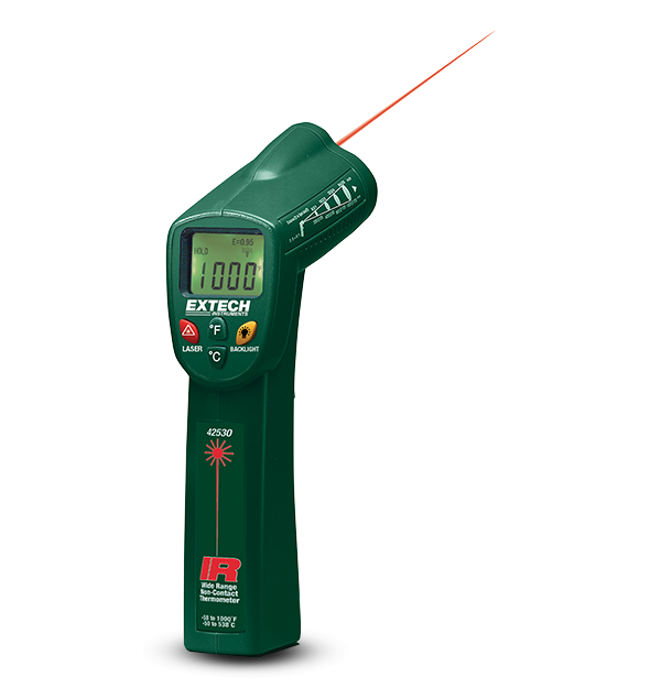 The Extech 42530 is a Wide Range IR Thermometer. It comes with a laser pointer that measures non-contact surface temperature up to 538°C (1000°F). This thermometer features an 8:1 distance to target ratio, fixed emissivity (0.95) that covers 90% of surface applications, audible and visual overrange indicators, and automatic data hold after the trigger is released. Comes with 9 V battery and carrying case.