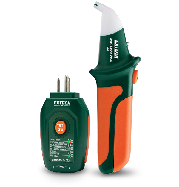Locate the correct circuit breaker or fuse without turning off the power with the Extech CB20 Circuit Breaker Finder, which employs automatic sensitivity to quickly and accurately pinpoint the correct 90 V to 120 VAC circuit breaker or fuse. The CB20 is ideal for a range of applications including locating branch circuit breakers without causing accidental power shutoffs, confirming proper wiring during electrical installation or repair, and testing receptacle ground fault operation. Complete with receiver, transmitter, and a 9 V battery.