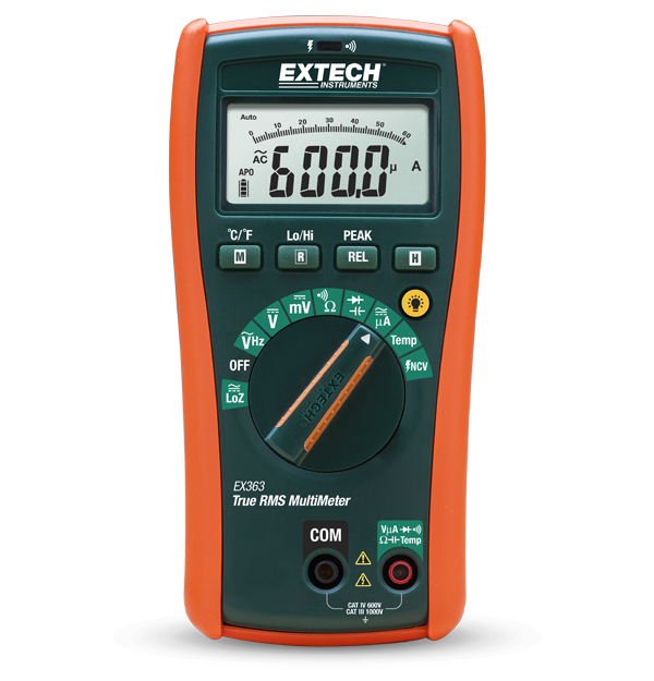 The Extech EX363 is a compact HVAC True RMS MultiMeter with a built in non contact voltage detector. It features highly accurate true RMS measurements, LoZ for the prevention of false readings caused by ghost voltages, .5% basic accuracy, a 1000 V AC/DC volt range, and resistance up to 40 MΩ. This device comes with a continuity beeper with visual alert, smart data hold and peak hold, auto power off with disable, relative mode for capacitance zero, and offset adjustment. Additionally, the EX363 excels in HVAC flame rod measurements with a µA function, as well as Type-K temperature measurements from -40°C to 394°C (-40°F to 742°F), and frequency and capacitance measurements. Complete with test leads, 9 V battery, holster with tilt stand, general purpose bead wire temperature probe, and built-in magnet.