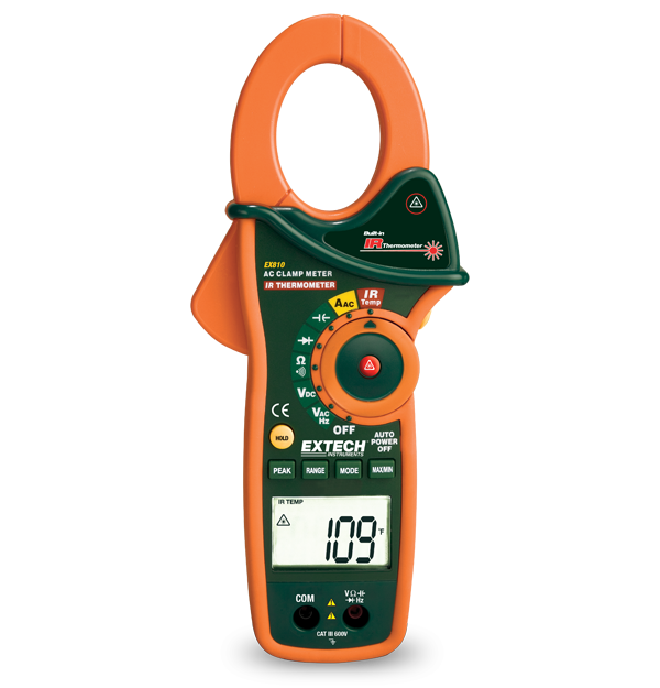 The EX810 Clamp meter features a built-in IR thermometer with laser pointer for non-contact surface measurements from -58 to 518 degrees Fahrenheit (-50 to 270 degrees Celsius). Clamp measures AC current up to 1000 Amp with a maximum resolution of 0.1 Amp. The 1.7 in. jaw fits around conductors up to 750MCM. Peak hold captures motor inrush currents and other surges. Data hold and auto power off functions. Other features include AC/DC voltage, resistance, capacitance and frequency. Complete with test leads, 9 Volt battery and case.