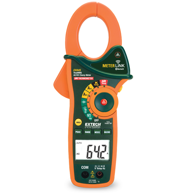 The Extech EX845 is a CAT IV True RMS 1000 A AC/DC clamp meter/multimeter with a built in IR Thermometer and wireless capability. The MeterLink™ Bluetooth transmitter wirelessly transmits voltage and current readings to selected FLIR thermal imaging IR cameras in order to incorporate meter readings with thermal images. Manual data collection results in unnecessary complexity and risk. MeterLink eliminates this problem by allowing the thermographer to quickly take a current reading on an electrical target and associate those readings with the corresponding targets stored in an infrared image. Complete with CAT IV test leads, 9 V battery, Type K probe, pouch case, and Professional Test Lead Set.