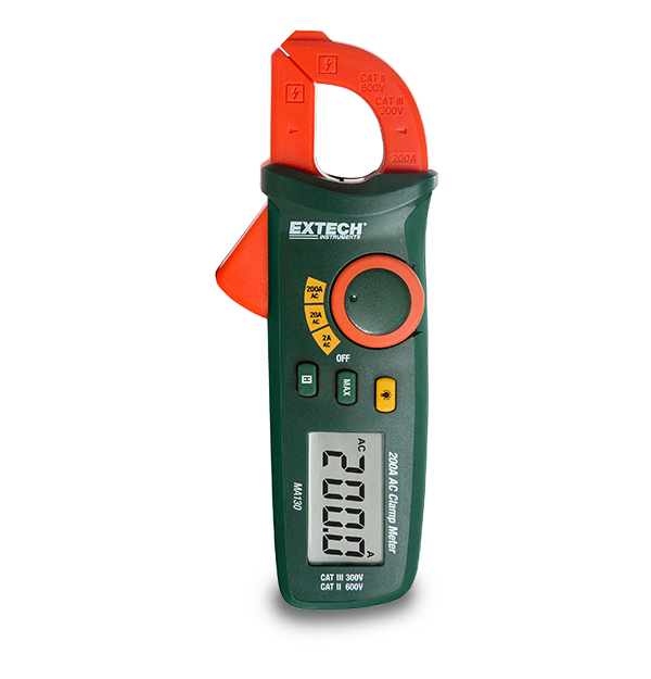 The Extech MA130 Mini 200 A AC Clamp Meter has an easy to use, pocket-sized design with a backlit LCD display and a 16 mm (0.6 in) jaw size that fits conductors up to 300 MCM. It allows measurements in tight locations and has manual ranging current measurements with three ranges to choose from. Features data hold to freeze readings on display and max hold to record maximum current readings. Complete with two AAA batteries.