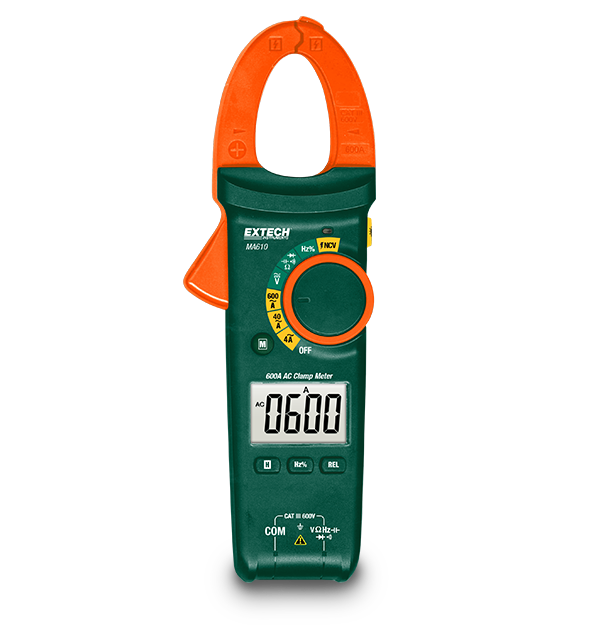 The Extech MA610 is a fully loaded clamp meter with multimeter functions including AC current, AC/DC voltage, resistance, frequency, and capacitance. It also has a built-in non-contact voltage (NCV) detector to quickly check circuits and wires for live voltages. The pocket-sized meter with 30 mm (1.2 in) jaw fits conductors up to 500 MCM and is designed with a large backlit LCD display to view in dimly lit area.