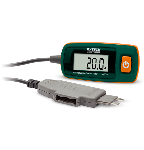The Extech AUT20 is an automotive 20 A Current Tester and ATC fuse. The ATC-blade connectors plug directly into the fuse block for ease of use. It has a measuring range of 20 A/48 VDC (10 seconds max), with 10 mA resolution. Includes one 12 V A23G battery.
