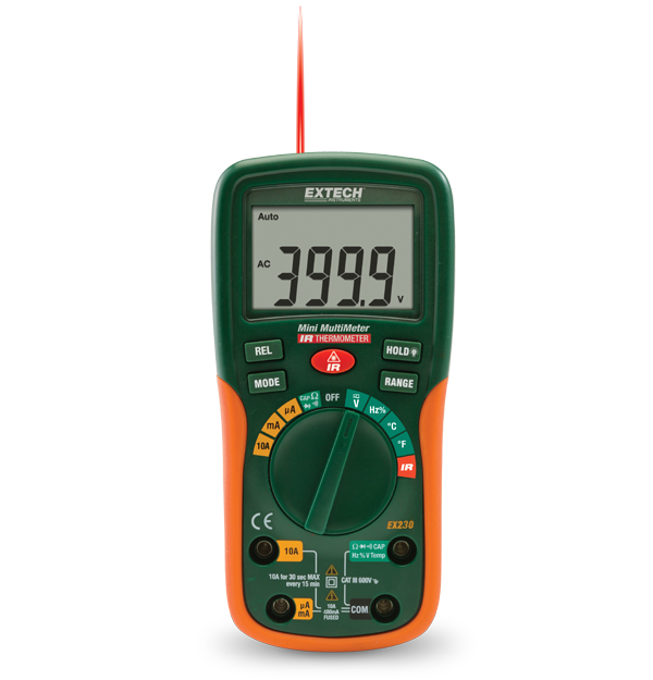 The Extech EX230 Mini Digital MultiMeter with built-in IR Thermometer can quickly identify overheating motors and locate hot spots on electrical panels or HVAC vents without contact. The EX230’s rugged design incorporates a 4000 count large backlit dual LCD with easy to read digits, low current capability measure down to 0.1 µA, and input fuse protection. The built in IR Thermometer has a 6:1 distance to target ratio. This meter also features Type K temperature, frequency, capacitance, and duty cycle measurement. It also has relative function, data hold capabilities, and an auto power off function. The EX230 comes complete with test leads, Type K Temperature bead probe, and a 9 V battery.
