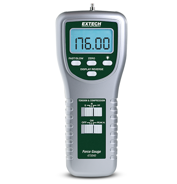 475040 is a Digital Force Gauge with a 5 digit LCD display and peak hold. Exclusive load cell measurement transducer. Over range, low battery and advanced function indicator. 5kg/176oz/49 Newtons measurement capacity. Basic accuracy of 0.4-percent. Complete with tension rod, carrying case and 4 adapters (flathead, cone, chisel and hook for tension), and 6 AA batteries.