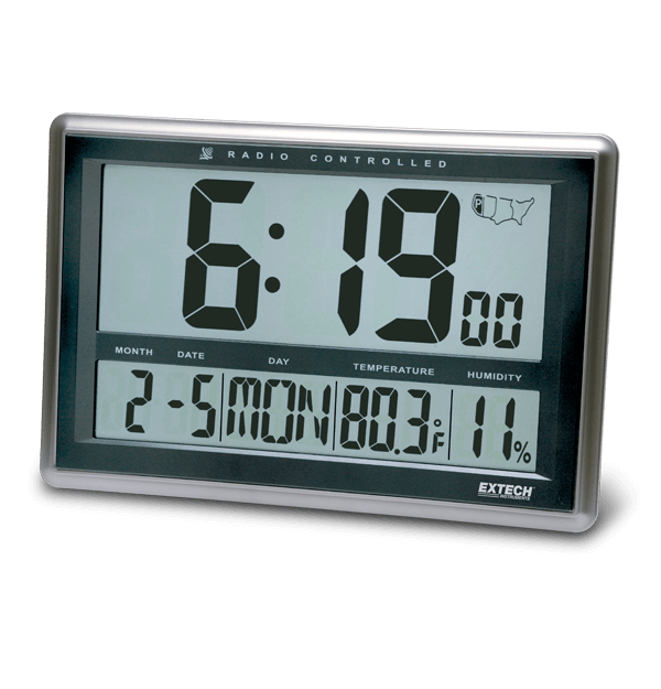 Large digital display with time, date, temperature, and relative humidity.