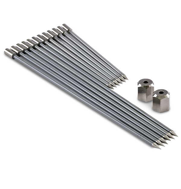 The Extech Mo290-PINS-EP includes 12 pins in 2 sizes (6 each): 8.9 cm (3.5 in) for short depths and 16.5 cm (6.5 in) for deeper penetration. Two locking nuts are also included in the package.