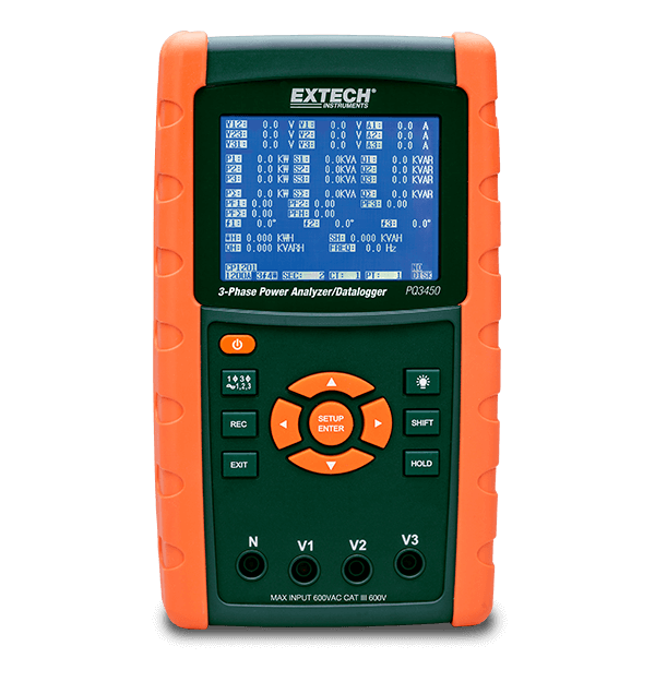 The Extech PQ3450 is a 3-phase power analyzer/data logger capable of logging up to 30,000 sets of measurements in Excel® format on a removable SD memory card. The product is easy-to-hold with a rugged over molded housing. It features a built-in clock and calendar, 35 parameters, and a CAT III 600V safety rating. Complete with a year warranty, 4 voltage leads with alligator clips, 8 AA batteries, SD card, 100-240 Volt AC adaptor and case. Clamp probes sold separately.