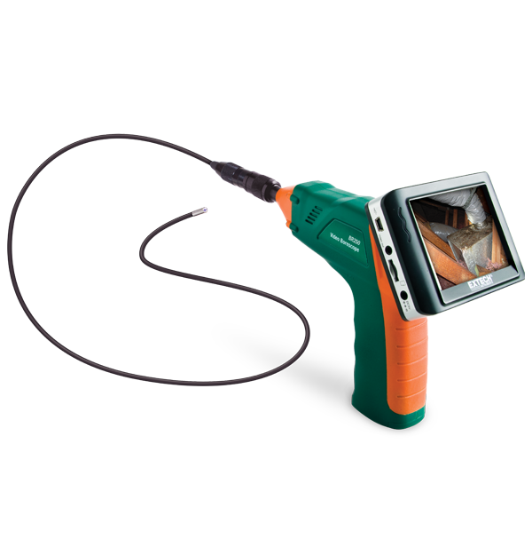 Extech’s BR250-4 Video Borescope Inspection Camera with a 4.5 mm camera provides a glare free, close up field of view. It includes a 8.9 cm (3.5 in) color TFT LCD wireless monitor that can be detached from the base and viewed from a remote location up to 9.8 m (32 ft) from measurement point. Images and videos can be captured with a date/time stamp and played back on the monitor or viewed on a PC via USB input. Ideal for home inspection, HVAC, and automotive applications.