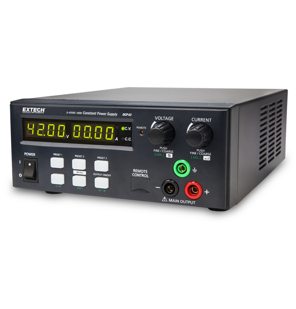 The Extech DCP42 is a 160 W Switching Power Supply. The single-output, continuous power supply with USB offers high efficiency electrical power conversion for greater energy conservation and lighter weight. Complete with power cord, software, and USB cable. Software includes DC ramp and waveform generator.