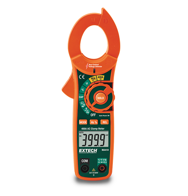The compact Extech MA410 400 A True RMS Clamp Meter offers plant maintenance techs, electrical contractors, HVAC troubleshooter, and DIYers a test instrument that delivers a high level of features at a great price. In addition to a host of core multimeter and current measurement capabilities, it also has a built in, non contact voltage (NCV) detector. The heart of the MA410 is a full function digital multimeter. The measurement functions cover most types of troubleshooting over and above noninvasive current probe measurements. This includes voltage, resistance, capacitance, frequency, duty cycle, diode, and continuity tests. Even measure temperature with the supplied Type K bead wire temperature probe. Comes with test leads, general purpose Type K wire temperature probe, two AAA batteries, carrying case, user manual, and a one year limited warranty.