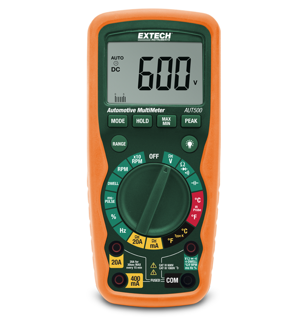 The Extech AUT500 Automotive Multimeter was designed specifically for automotive technicians, DIYers, and modders who demand a tough meter that's waterproof and shock resistant. The AUT500 delivers every multimeter function you need to effectively troubleshoot automotive and fleet electrical and electronic systems. Designed to withstand harsh environments and usage, the meter's rugged, double-molded housing is IP67-rated (waterproof and dustproof) as well as drop tested to 6 feet. For shade tree mechanics or crews doing roadside fleet repairs, using a DMM outdoors during harsh conditions is no longer a concern no matter the weather. Includes double-molded test leads, inductive pickup, type K bead wire temperature probe, magnetic hanging strap, 9 V battery, hard carrying case, and operating instructions.
