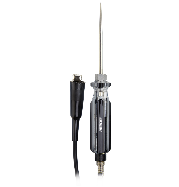 Comprobador de voltaje CA/CC de tamaño compacto Extech ET30B con una sonda de prueba integrada de acero inoxidable de 103 mm (40,5 pulg.). Viene con un cable de 1,5 m (5 pies) y una pinza de cocodrilo aislada, y funciona sin batería.