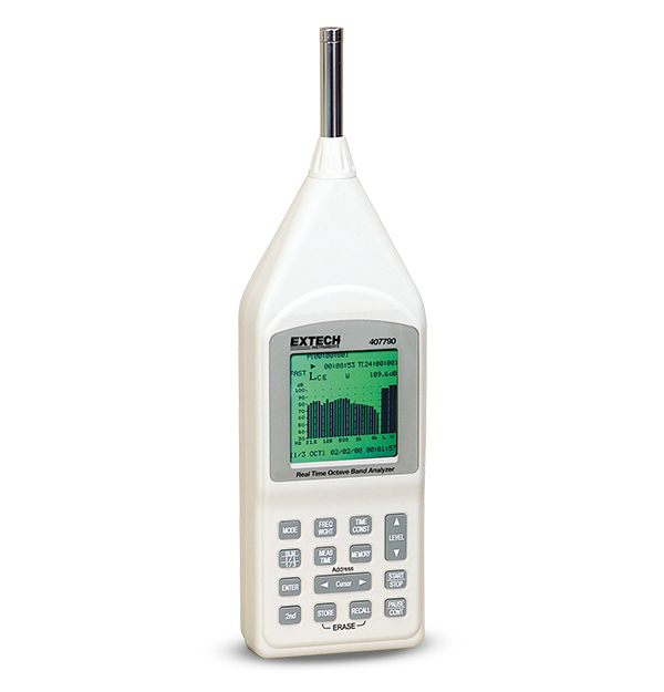 The Extech 407790 Real Time Octave Band Analyzer is a Type 2 integrating sound level meter with octave and 1/3 octave band real time display. The 160 x 160 dot matrix backlit LCD displays Leq, LE, Lmax, Lmin, and Lp. It features a 25 Hz to 10 kHz frequency response, real time clock, and an A, C, and flat weighting with fast and slow response time. The built-in memory stores up to 12,280 records in SLM mode and 1024 data points in 1/1 or 1/3 octave mode. This memory can easliy be transferred to a PC via RS-232 interface and analyzed using included software.