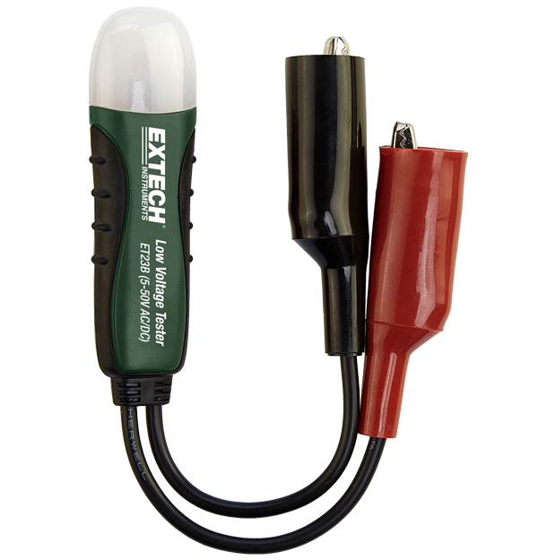 El Extech ET23B es un detector de bajo voltaje de CA/CC compacto, capaz de medir de 5 V a 50 V. Presenta un indicador de voltaje de luz neón, pinzas de cables de cocodrilo de prueba incorporadas, clip de bolsillo y carcasa aislada. Incluye dos años de garantía.