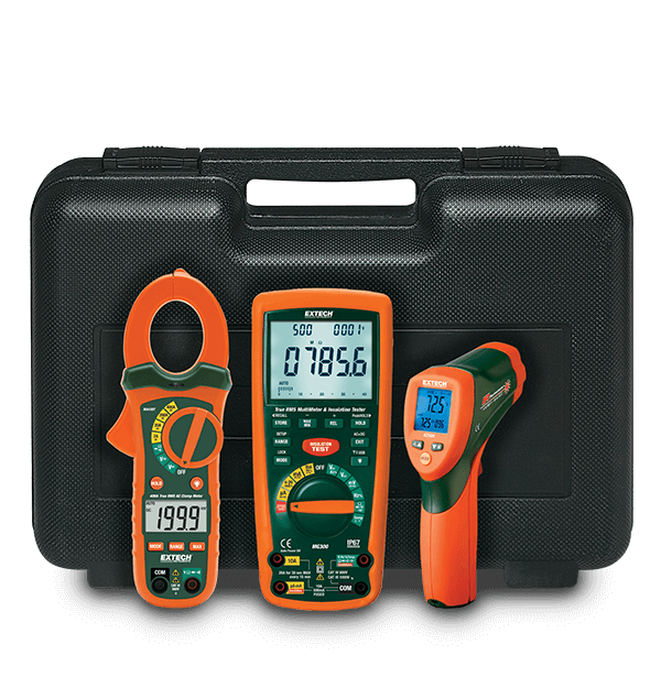 The Extech MG300-ETK Electrical Troubleshooting Kit includes three compact tools that are indispensable at a customer site for electrical installation, troubleshooting, and repair. The first tool in the kit is the MG300, a 13 Function Wireless True RMS Multimeter/Insulation Tester featuring 125 V, 250 V, 500 V, and 1000 V test voltages, plus insulation resistance from 0.001 MOhm to 4000 MOhm and many other functions at a CAT IV 600 V safety rating. The second tool is the 42509 Dual Laser IR Thermometer with Color Alert which measures IR temperature up to 510°C (950°F). The third tool in this kit is the MA430T 400 A True RMS AC/DC Clamp Meter with a built in non contact voltage detector, 6 additional functions, and a CAT III 600 V safety rating.