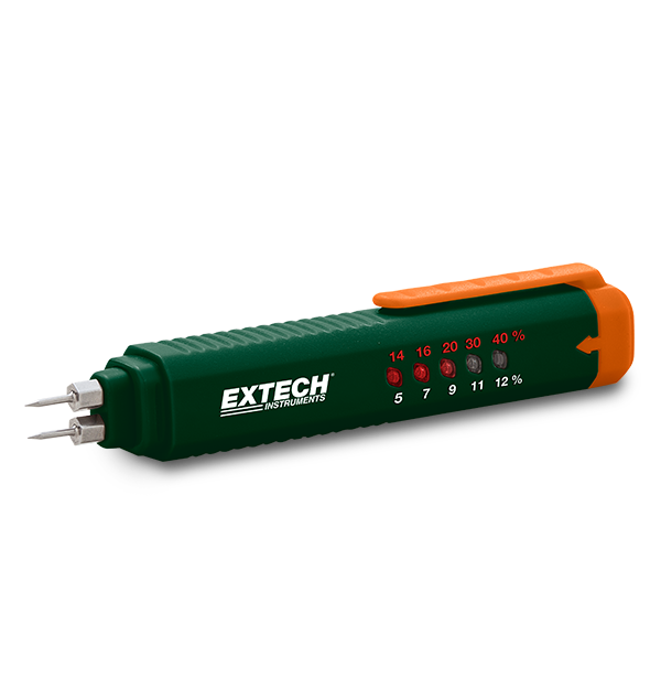 Extech MO25 es un medidor de humedad compacto, ligero y con estilo de bolígrafo para madera y materiales de construcción. Después de seleccionar uno de los diez niveles de humedad, se indica al usuario mediante una alerta sonora y luces indicadoras LED que el objeto que se está midiendo supera cierto umbral. Este bolígrafo higrómetro cuenta con una función de retención de datos, verificación del nivel de batería y se apaga automáticamente cuando no se utiliza. Utilícelo en tabiques, placas de yeso, cartón, yeso, hormigón y cemento. Incluye dos clavijas (instaladas), tapa protectora, clip de bolsillo incorporado y una batería AAA.