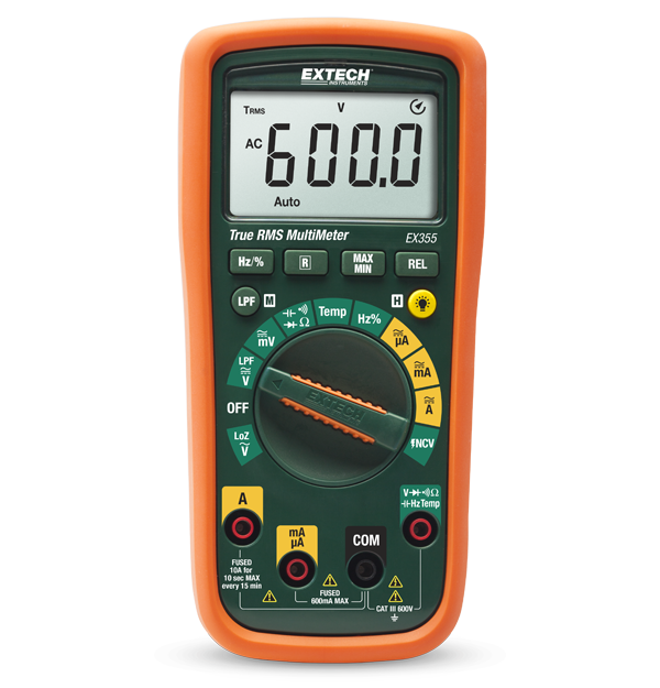 The EX355 is a professional DMM loaded with advanced features and functions. Low Impedance (LoZ) mode eliminates false readings caused by ghost voltages. Low Pass Filter (LPF)attenuates high frequencies to reduce noise for accurate readings. True RMS provides accurate readings when measuring distorted or noisy waveforms. Built-in Non-Contact AC Voltage Detector quickly checks for the presence of AC Voltage before testing. Features a 6000 count LCD display, data hold, min-max, relative mode, capacitance zero, auto power off, continuity and diode test. This meter will measure AC/DC voltage to 600 V and AC/DC current to 10 amps. Complete with test leads, general purpose bead wire temperature probe, manual and two AA batteries.