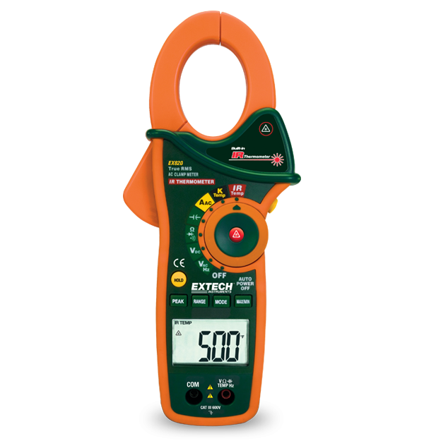 The Extech EX820 True RMS AC Clamp Meter features a built-in IR Thermometer with a laser pointer for non-contact surface measurements ranging from -50°C to 270°C (-58°F to 518°F). Clamp measures AC current up to 1000 Amp with a maximum resolution of 0.1 Amp. The 4.3 cm jaw fits around conductors up to 750 MCM. Peak hold captures motor inrush currents and other surges. Includes data hold and auto power off. Other functions consist of AC/DC voltage, resistance, a Type-K thermometer, capacitance, and frequency. Complete with test leads, Type-K temperature probe, 9 Volt battery, and a case.