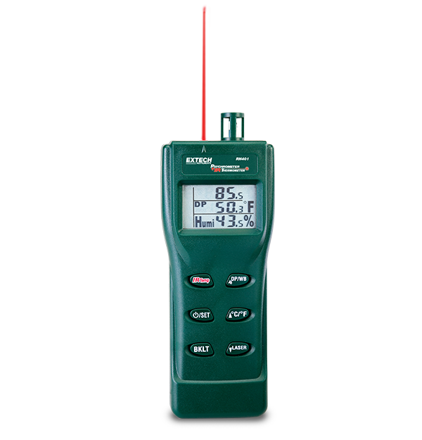 The Extech RH401 is a Digital Psychrometer with a built in IR Thermometer that allows for quick, non contact surface temperature measurements. It displays air temperature, humidity, surface temperature or dew point, and wet bulb, all on a triple LCD with backlighting. The IR thermometer features adjustable emissivity and a spot to distance ratio of 8:1. The meter calculates temperature difference between IR surface temperature and dew point. Other features include data hold, programmable auto power off, and a retractable probe that protects the sensors when the meter is not in use. Includes hard case and four AAA batteries.