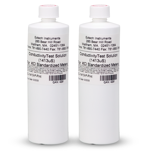 Extech EC-1413-P contient deux bouteilles d’étalons de conductivité 1413 µS, 1 pinte de solution préfabriquée de chacune. Le modèle EC-1413-P est destiné à être utilisé avec les conductimètres Extech comme le conductimètre ExStik EC400/TDS/appareil de mesure de salinité ou la trousse de conductivité DO/pH/DO610 ExStik II.