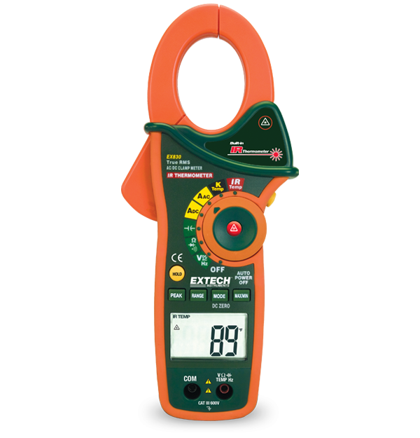 Le multimètre à pince EX830 est doté d’un thermomètre infrarouge sans contact intégré unique avec un pointeur laser pour surveiller la température et localiser les points chauds sur les moteurs et les appareils électriques. Un grand écran ACL de 4 000 unités avec rétroéclairage lumineux vous permet de voir le relevé dans un éclairage faible. Le boîtier à moulure double ergonomique offre une meilleure prise pour une utilisation à une seule main. L'ouverture de la mâchoire de 43 mm (1,7 po) de diamètre est assez grande pour les conducteurs jusqu'à 750 MCM. En plus du courant CA/CC, il mesure la tension CA/CC, la résistance, la température, la capacitance et la fréquence. Il comprend les fonctions suivantes : test de diode, signal sonore de continuité, min/max, mise en attente des données, mise hors tension automatique et mise en attente de crête rapide qui capture les courants d’appel et les transitoires. Comprend des fils d'essai, une pile 9 V, une sonde de température à fil métallique de type K (-20 à 250 °C/-4 à 482 °F) et un étui de ceinture.