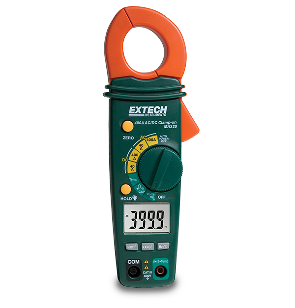 The Extech MA220 AC/DC Clamp Meter offers high accuracy current measurements and a compact size for measuring in tight locations. The MA220's functions include AC/DC voltage and current (600 V/400 A), capacitance (100 µF), frequency (150 kHz), temperature (-50°C to 1000°C/-58°F to 1830°F), and duty cycle (0.5% to 99.0%). It also has a 4,000 count LCD display, data hold, and auto zero on start up, as well as auto ranging and auto power off functions. This clamp meter has a 23 mm (0.9 in) jaw size that accommodates conductors up to 300 MCM. Comes with test leads, Type K bead wire temperature probe, case, two AAA batteries, and user guide.