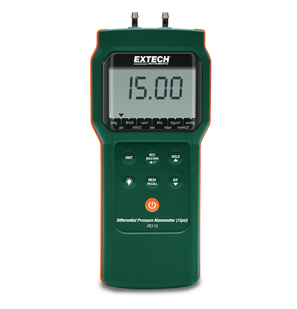 The Extech PS115 Differential Pressure Manometer is ideal for field, manufacturing, or lab/R&D use. It offers a 15 psi range, readings in 11 units, and high resolution. The manometer also features a large LCD display with backlighting, data hold, auto power off/disable, and a zero function for offset correction or measurement. This product is complete with 6 AAA batteries, two connection hoses, and a hard carrying case.