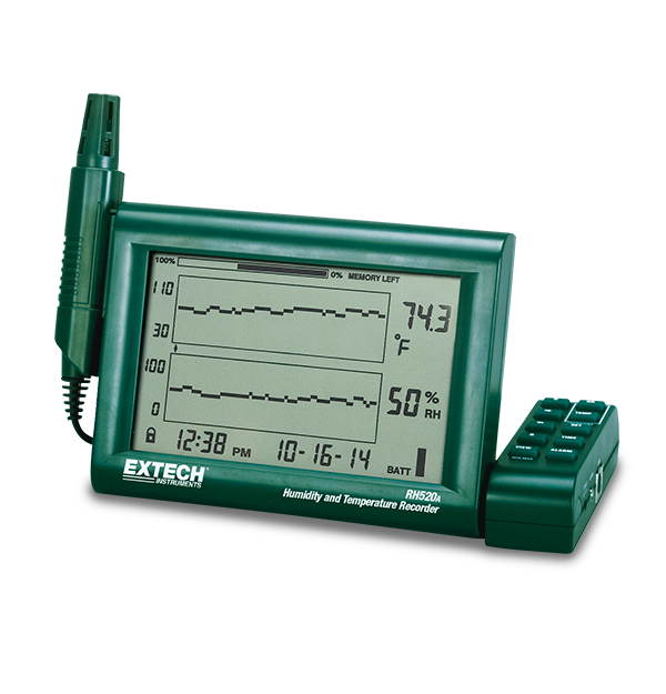 The Extech RH520A-240 provides simultaneous digital and graphical display of relative humidity and temperature. The display also shows dew point, date and time, and min/max measurements. Stored readings can be recalled on the display or downloaded to a PC to obtain a permanent record. Provisions for wall mounting or the control panel swivels to act as a desk stand. The user can set audible and visual alarms with high and low limits for humidity and temperature. ExChart software calculates Wet Bulb and Grains per Pound (GPP). Comes complete with a detachable sensor probe and 1 m cable, RS-232 cable with USB adapter, Windows-compatible software, 240 VAC adapter, and three AA batteries.