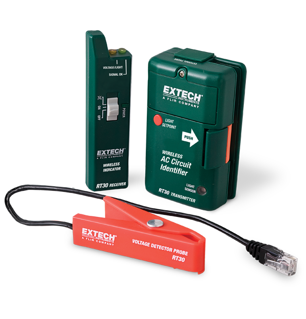 Le modèle polyvalent Extech RT30 utilise un émetteur de détecteur de tension sans contact de la taille d’un téléavertisseur qui se fixe sur le câblage en cours de fonctionnement et transmet un signal de « tension présente » à un récepteur de poche porté par l’utilisateur. Fixé sur un câble sous tension, l’émetteur envoie à l’utilisateur opérant au niveau du disjoncteur des signaux LED et sonores sur le récepteur (portée jusqu’à 100 m). Les alertes cessent lorsque le bon disjoncteur est éteint et que les travaux peuvent être réalisés en toute sécurité. L’émetteur et le récepteur de l’identificateur de circuit CA sans fil RT30 sont fournis avec une sonde de type pince à distance, 4 piles AAA, une pochette et des instructions d’utilisation. Les États-Unis, le Mexique et le Canada utilisent le modèle 914 MHz et la majorité des autres pays utilisent le modèle 869 MHz.