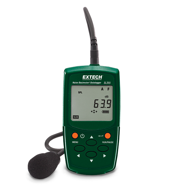 The Extech SL355 is a compact, lightweight Noise Dosimeter designed to test exposure and provide surveys for compliance with OSHA, MSHA, DOD, ACGIH, and ISO standards. Featuring a USB interface and Windows-compatible software to control setup and retrieve stored events or analyze measurements, this dosimeter provides adjustable criterion level, exchange rate, and threshold. It can also measure frequency weighted noise exposure and peak sound level simultaneously. Comes with belt clip, clip on 12.7 mm (0.5 in) microphone with 0.8 m (2.6 ft) cable, 3 AAA batteries, mini screwdriver carrying case, PC software, USB cable, and user manual.