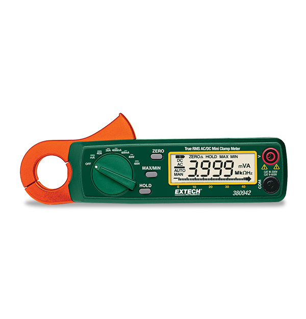The compact Extech 380942 is a 30 Amp mini AC/DC clamp meter. The clamp meter has a remarkable 0.1mA resolution (AC), very low-current sensitivity, and a small diameter jaw designed to reach into small areas. The 30 Amp range with 0.1mA (AC) and 1mA (DC) resolution is optimized for finding problems where very low current variances would be missed by standard clamp meters. This mini clamp meter is useful for troubleshooting tasks in plant maintenance, electrical, HVAC, and telecom work, as well as residential electrical, fleet maintenance, marine, and motorcycle repairs. This CAT III-rated True RMS mini clamp meter comes with test leads, 2 AA batteries, soft carrying case, and user manual.