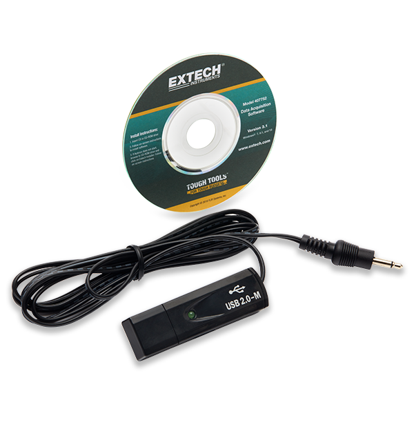 The Extech 407752 Software and Cable features a disc of manometer data acquisition software and a connector RS-232 cable. For use with the 407750 Sound Level Meter.
