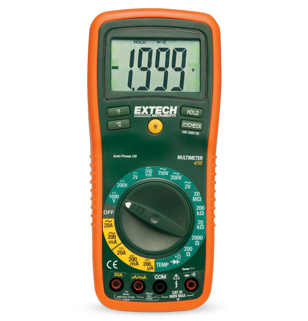 Compact and powerful, the Extech EX410 8 Function true RMS Professional MultiMeter provides the versatility of multiple meters in one convenient device. The EX410 measures AC/DC voltage and current, resistance, diode, and temperance. A large, backlit display and 2.5 cm (1 in) high digits allow for easy reading, while the ergonomically designed housing offers comfortable, one-handed operation. Comes with the multimeter, CAT III test leads, stand, hanging strap, holster with built-in test lead storage, Type K bead wire temperature probe, and one 9 V battery.