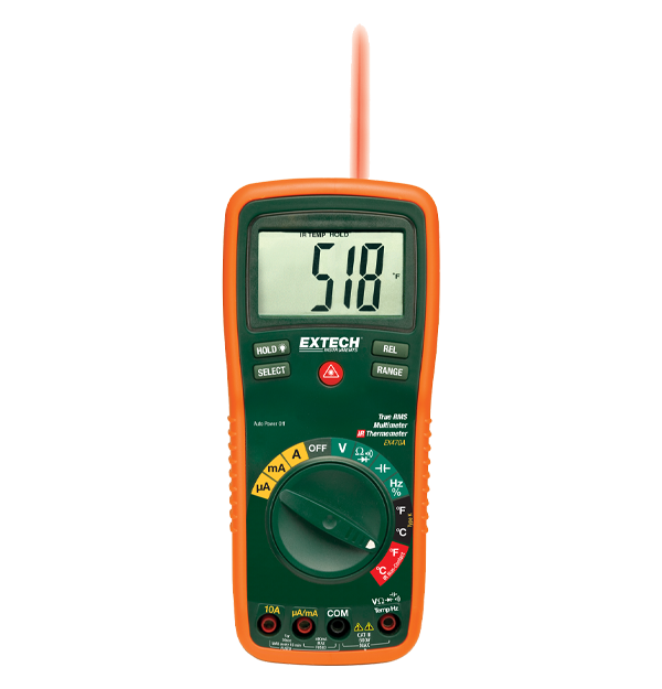 The Extech EX470 True RMS Multimeter and Infrared Thermometer with 2 Type K remote probes is the perfect meter for HVAC or plant maintenance. The IR thermometer measures surface temperature from -20°C to 270°C (-4°F to 518°F) without contact. The built-in laser pointer centers the measuring area. Multimeter functions include AC/DC voltage to 600 V, AC/DC current to 20 A, resistance to 40 MOhm, continuity, and diode test. It also includes a Type K thermometer for contact or air temperature measurements from -20°C to 750°C (-4°F to 1832°F). Advanced functions include capacitance, frequency, and duty cycle. The meter comes complete with test leads, Type K temperature probe, 9 V battery, protective holster, adjustable tilt stand, and velcro hanging strap.