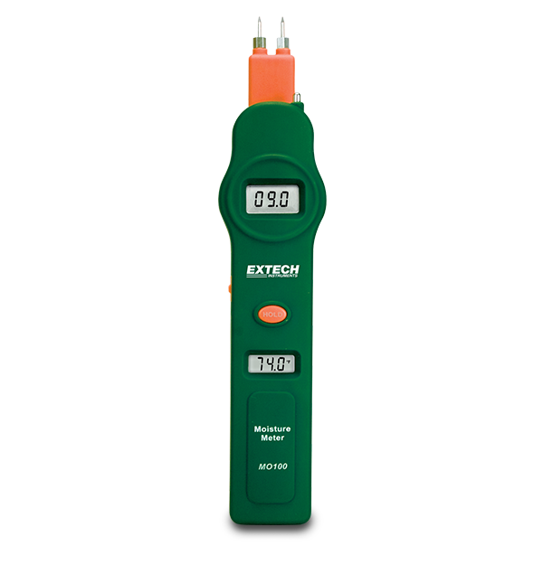 The Extech MO100 is a pocket-sized moisture meter for measuring moisture content in wood, plaster, and building materials. It features a unique dual LCD display showing both wall moisture (0 to 100) and air temperature (0°C to 50°C/32°F to 122°F) simultaneously. The multi-position sensor pins retract for safe storage. Easy to operate with a selectable side switch (Off, Test, Calibrate), the Extech MO100 also offers data hold to freeze readings on the screen and calibration adjustment for increased repeatability. It comes complete with spare pins, two AAA batteries, and storage case.