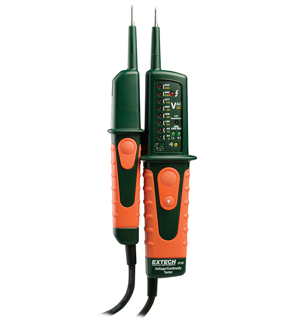 The Extech VT10 Multifunction Voltage Tester has LED AC voltage indications for 24 V, 48 V, 120 V, 208 V, 240 V, 277 V, 480 V and 600 V, as well as LED DC voltage indications for 6 V, 12 V, 24 V, 36 V, 48 V, 110 V, 220 V and 400 V. This tester has polarity detection with the LEDs for a positive and negative DC indication. Capable of running a continuity test with an audible tone. Phase rotation test for the motors, two handed operation tester for low impedance testing. Also, this tester has a built-in flashlight for testing in low lit or tight areas. The voltage function operates with out any batteries and it has a rubberized, double-molded IP64 housing.