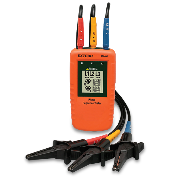Il tester di sequenza di fase 480400 presenta una gamma nominale compresa tra 40 e 600 V per verificare l’orientamento di fase delle fonti di alimentazione trifase su una gamma di frequenza compresa tra 15 e 400 Hz. Il display LCD indica l’orientamento della fase (senso orario o antiorario) e se ciascuna fase è sotto tensione. Non è richiesta alcuna batteria. Il misuratore è dotato di cavo e di tre grandi morsetti a coccodrillo con codifica colore, custodia e batteria.