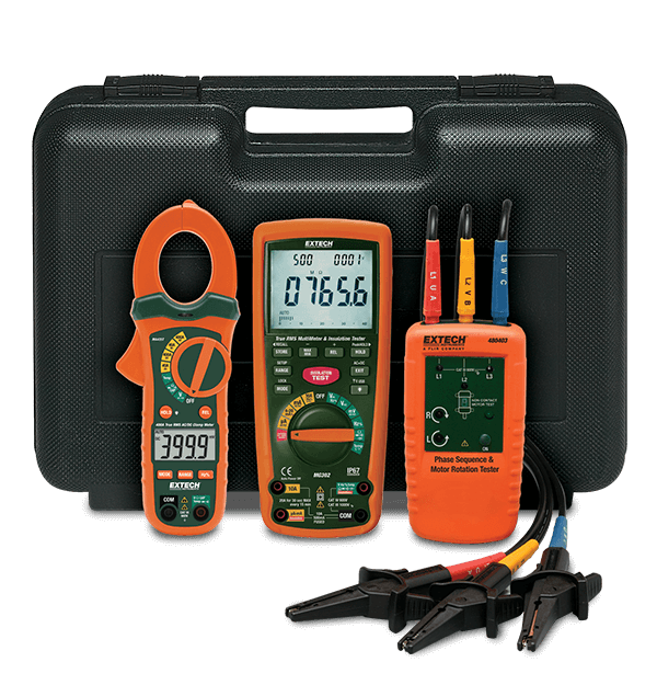 The Extech MG302-MTK Motor and Drive Troubleshooting Kit includes three compact tools for troubleshooting three phase motors and drives. The first tool in the kit is the MG302, a 13 Function Wireless True RMS Multimeter/Insulation Tester featuring 125 V, 250 V, 500 V, and 1000 V test voltages. It also features insulation resistance from 0.001 MOhm to 4000 MOhm, auto discharge of capacitive voltage, a lock power on function for hands free operation, data hold, min/max, relative mode, auto power off and more at a CAT IV 600 V safety rating. The second tool is the 480403 Motor Rotation and Three Phase Tester that features a double molded, durable housing and CAT III 600 V safety rating. The third tool in this kit is the MA435T 400 A True RMS AC/DC Clamp Meter with a built in non-contact voltage detector, 10 functions and a CAT III 600 V safety rating.