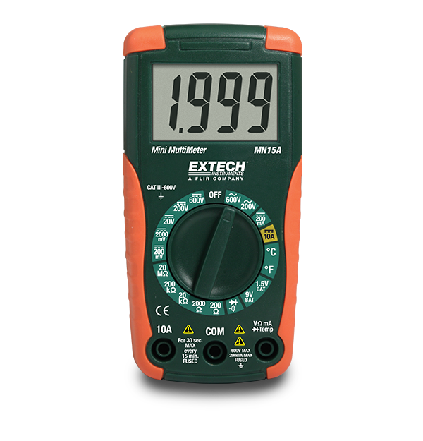 Small on size and configured with vital functionality, the compact, manual-ranging Extech MN15A Digital Mini Multimeter is a popular choice for anyone who prefers a smaller meter they can carry in a pocket or tool belt. Handy for quick testing, use it to measure AC/DC voltage and DC current, as well resistance with functions for testing diodes and checking for continuity. Plus, the battery test function lets you quickly check the condition of 1.5 V and 9 V batteries. The MN15A comes with a built-in stand, 9 V battery, test leads, and a general purpose temperature probe.