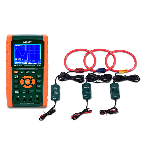 The Extech PQ3470-30 is a 3-phase graphical power and harmonics analyzer/datalogger capable of logging up to 30,000 sets of measurements on a removable SD memory card. The meter features a 3-phase voltage or current unbalanced ratio (VUR, AUR) and unbalanced factor, a wide sampling rate range (2 seconds to 2 hours), and a built in clock and calendar. It is capable of capturing transient events such as dip, swell, and outage with programmable threshold (%). Complete with 4 voltage leads with alligator clips, 8 AA batteries, SD card, 100 V - 240 V AC adaptor, three 3000 A current probes, and a case.
