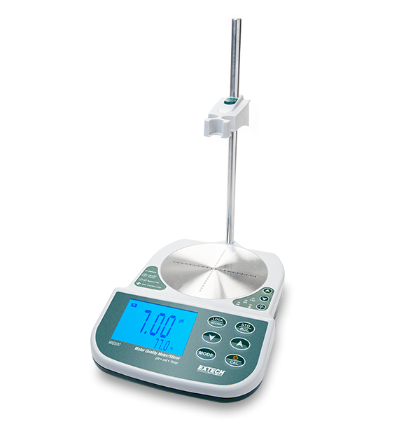 The Extech WQ500 is a 3 in 1 Benchtop Meter that measures pH, ORP, and temperature of liquids and semi-solids. The unit features a 30 min, 60 min, and 120 min timer or continuous stirring, plus 2 or 3 point pH calibration and automatic temperature compensation. This unit features a large backlit dual display and the ability to store and recall 150 readings. It can also capture readings directly to a PC via the built in USB interface. The WQ500 comes with pH glass electrode, temperature probe, pH calibration solutions (4 pH and 7 pH), plastic burette, polishing paper, electrode clamp and rod, software and USB cable, AC adapter, stirrer, and user manual.