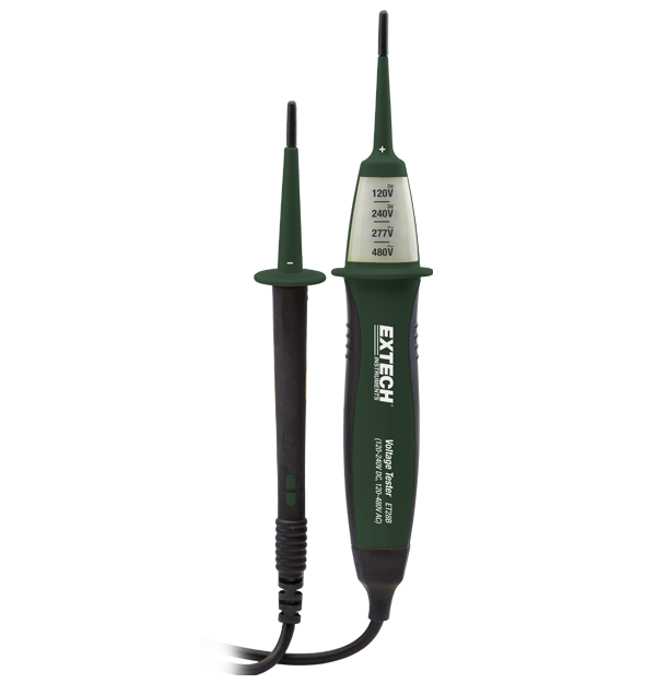 The Extech ET28B is a compact size Voltage Detector that measures 120 V to 480 V of alternating current and 120 V to 240 V of direct current. It features a neon light voltage indicator, built-in test lead with removable protective caps, a 73.6 cm (29 in) long cable, and insulated housing. Comes with a two year warranty.
