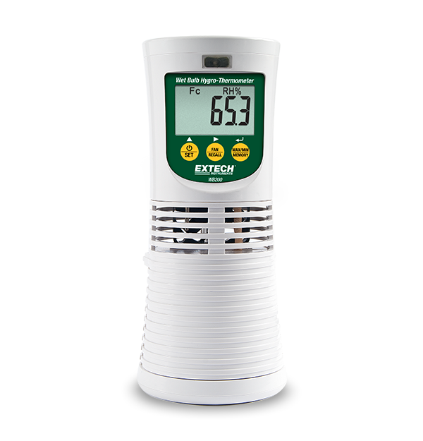 Ideal for monitoring humidity and temperature levels in a wide range of locations, the Extech WB200 combines traditional dry and wet bulb operation with electronic circuitry to provide accurate readings and trouble-free operation, especially in dusty environments. A built-in fan provides fast response time. It has audible and visual alerts for temperature and humidity levels higher or lower than the user programmed high/low set points. The datalogger featuring user programmable sampling rates (15 to 60 minutes) stores 100 records that can easily be recalled on the display. Measures wet bulb, dew point, temperature (5°C to 50°C / 41°F to 122°F), and relative humidity (0.0% RH to 99.9% RH). Comes with four AAA batteries, 100 V - 240 V universal AC adapter, and user manual.