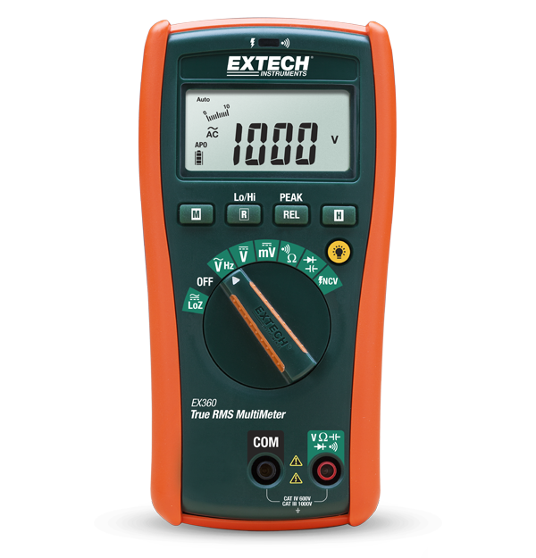 The Extech EX360 is a compact electrical true RMS multimeter with a built in non contact voltage detector. It features highly accurate true RMS measurements, LoZ for the prevention of false readings caused by ghost voltages, .5% basic accuracy, a 1000 V AC/DC volt range, resistance up to 40 MΩ, continuity beeper with visual alert, smart data hold, peak hold, auto power off with disable, relative mode for capacitance zero, and offset adjustment. Additionally, the EX360 excels in frequency and capacitance measurement. Complete with test leads, 9 V battery, holster with tilt stand and built-in magnet.