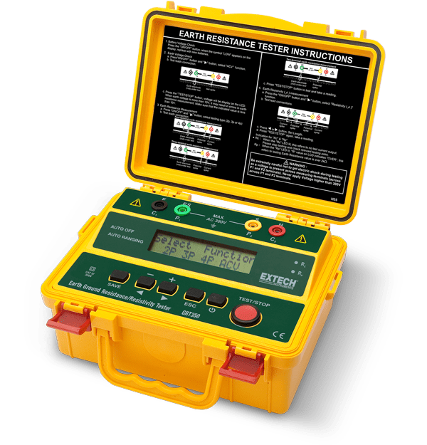 The Extech GRT350 is a 4-Wire Earth Ground Resistance and Resistivity Tester which measures earth ground resistance from 2 Ohm to 2000 Ohm and resistivity from 0.06 ohm-m to 628 ohm-m. The GRT350 supports 4-wire, 3-wire, and 2-wire testing. It has a large dual line LCD, automatic spike check, test hold function, auto ranging, data hold, and auto power off function. This tester can also store and recall up to 200 test results and has over range and low battery indications. Product is complete with test leads with alligator clips, 4 auxiliary earth bars, hard carrying case, user's manual, and eight 1.5 V AA batteries. CE certified with a CAT IV 300 V safety rating.