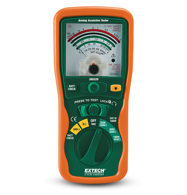 The Extech 380320 is an Analog Insulation Tester with a large, easy to read analog display. It features a live circuit warning which displays the actual AC voltage measurement. It also includes an automatic discharge circuit, lock power on feature for extended test times, and insulation resistance up to 400 MΩ. Complete with heavy duty test leads, alligator clip test lead, 6 AA batteries, hanging strap, and hard carrying case.