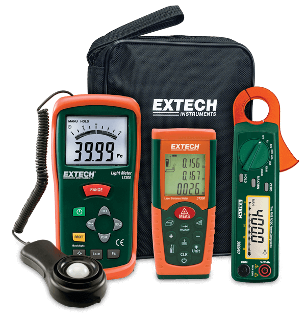 Designed for professionals who audit existing and replacement lighting systems for energy efficiency and lighting performance, the Extech LRK15 Lighting Retrofit Kit is ideal for verifying lighting system output after installations and retrofits. The kit features three compact tools that are indispensable at various locations: the easy-to-use LT300 light meter that measures up to 200,000 Lux/20,000 Fc, and the DT300 laser distance meter with built-in tools to quickly calculate area, and the 380940 400 A AC/DC clamp meter with a built-in wattage measurement. The kit is supplied in a soft carrying case that provides protection and organization for the meters and accessories.